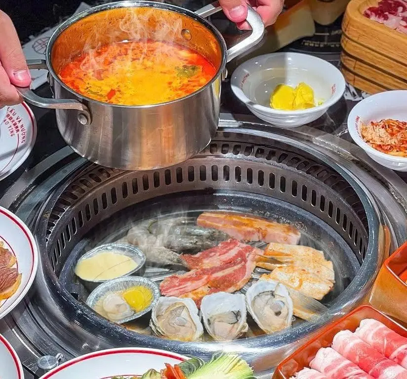 Menu buffet khá đa dạng, kết hợp giữa nhiều loại thịt bò, thịt heo, hải sản tươi và nhiều vị lẩu khác nhau như Mala Tứ Xuyên, TomYum hay lẩu canh xương, mang đến sự lựa chọn phong phú cho thực khách yêu thích cả nướng lẫn lẩu. Đây là điểm đến đáng thử nếu bạn muốn trải nghiệm buffet lẩu nướng phong cách mới lạ tại Gò Vấp.